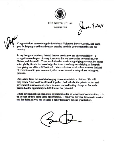 Received the President of the United States of America Volunteer Service Award from the President's Council on Service and Civic Participation (Through service to others, you demonstrate the outstanding character of America and help strengthen our country) from President George W. Bush and from President Barack Obama;